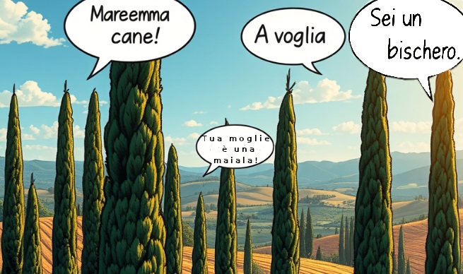 Conviene poi, in omaggio al recente convegno organizzato dall’Accademia della Crusca sul linguaggio usato nei polizieschi, spendere qualche parola su tale aspetto. In una prosa controllata, non senza qualche venatura di lirismo, affiorano sulla bocca dei personaggi toscanismi come “grullo” “bischero” e “maiala”, ma è soprattutto l’imprecazione contro la Maremma, a cui si accompagnano un gran numero di epiteti fino al poco frequente “laida”, a dare il colore della parlata locale. Da notare anche l’occorrenza dell’espressione “A voglia”in inizio di discorso, in effetti piuttosto inusuale in valdelsa, dove prevale l’enfatizzante “ha’ voglia”.